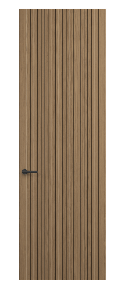 SELECT — коллекция минималистичных дверей с фрезеровкой по натуральному шпону. Рельеф на поверхности полотна создаёт игру света и тени, добавляя пространству динамичности и визуального объёма. Двери SELECT в сочетании со стеновыми панелями и мебельными фасадами, повторяющими лаконичный дизайн, создают единое стилевое решение.